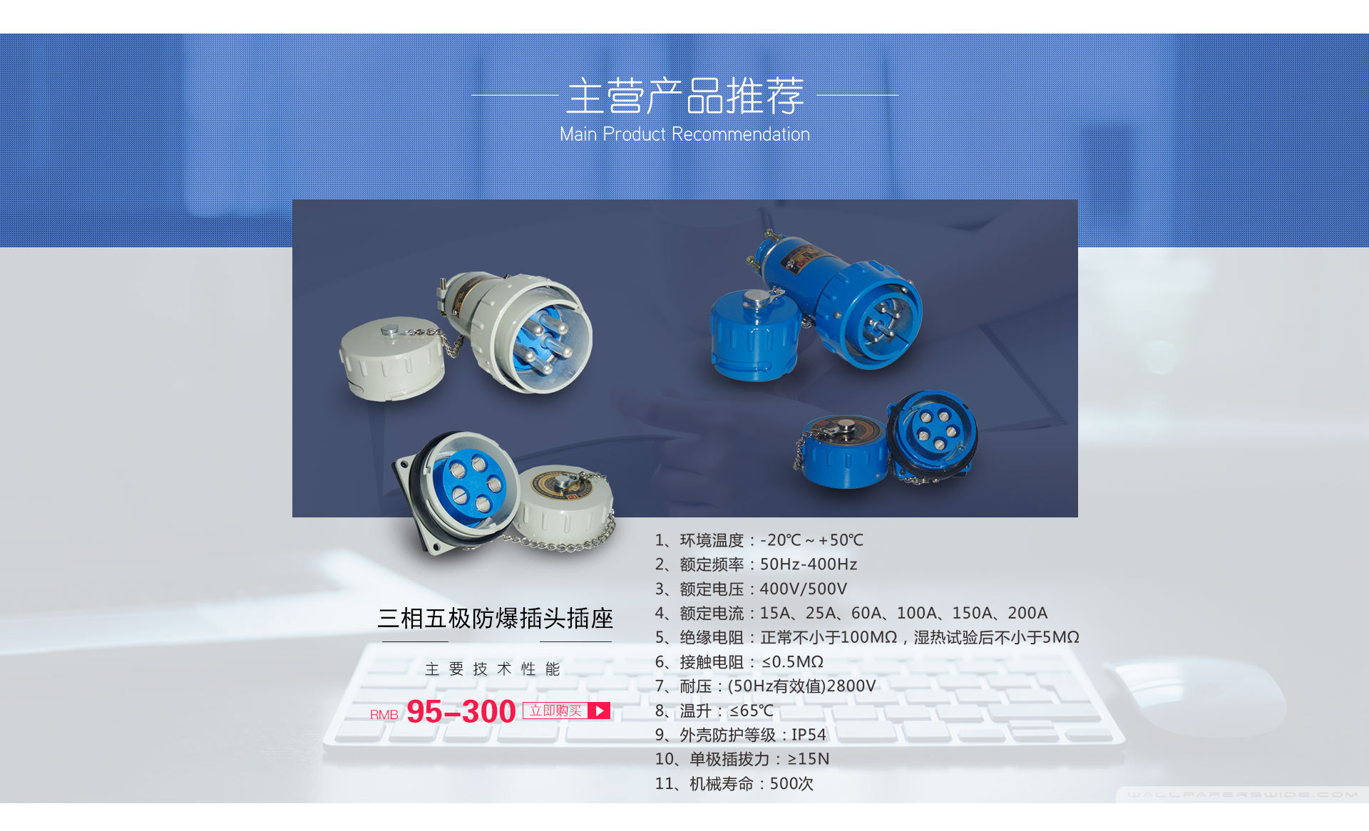 乐清市友泰电气有限公司,位于乐清市北白象镇经济开发区,是专业从事研制开发、生产电连接器的企业,公司于2005年荣获高新技术企业称号。公司按JB/T2729-1999标准设计生产的交流移动电站用三相四极插头插座和按GB3936.8-2003《爆炸性气体环境用电气设备的第8部分“n”型电气设备》标准设计生产的无火花防爆型插头座。两大主导产品系列有:15A、25A、60A、100A、150A、200A、300A以及单芯系列400-1000A移动式插头(YT)固定式插座(GZ)和移动式插座(YZ)等几十个品种。 产品系铝合金壳体,镀银结仇体,整体结构具有轻巧美观、插拔快捷、防水抗震、接触可靠、耐用。广泛用于石油、国防、电力、航空、矿山等领域。公司还根据市场需要,研发并生产多种型号的多芯防水插头座,并上照明和分线用插头座及三通接线盒,斜插防水弯接头,大电流单芯连接器等。大量用于井上电器、电控房、移动房、特车及部队野外装备等,满足油田物探、钻井、采油及军工等方面的需要,深受用户欢迎。